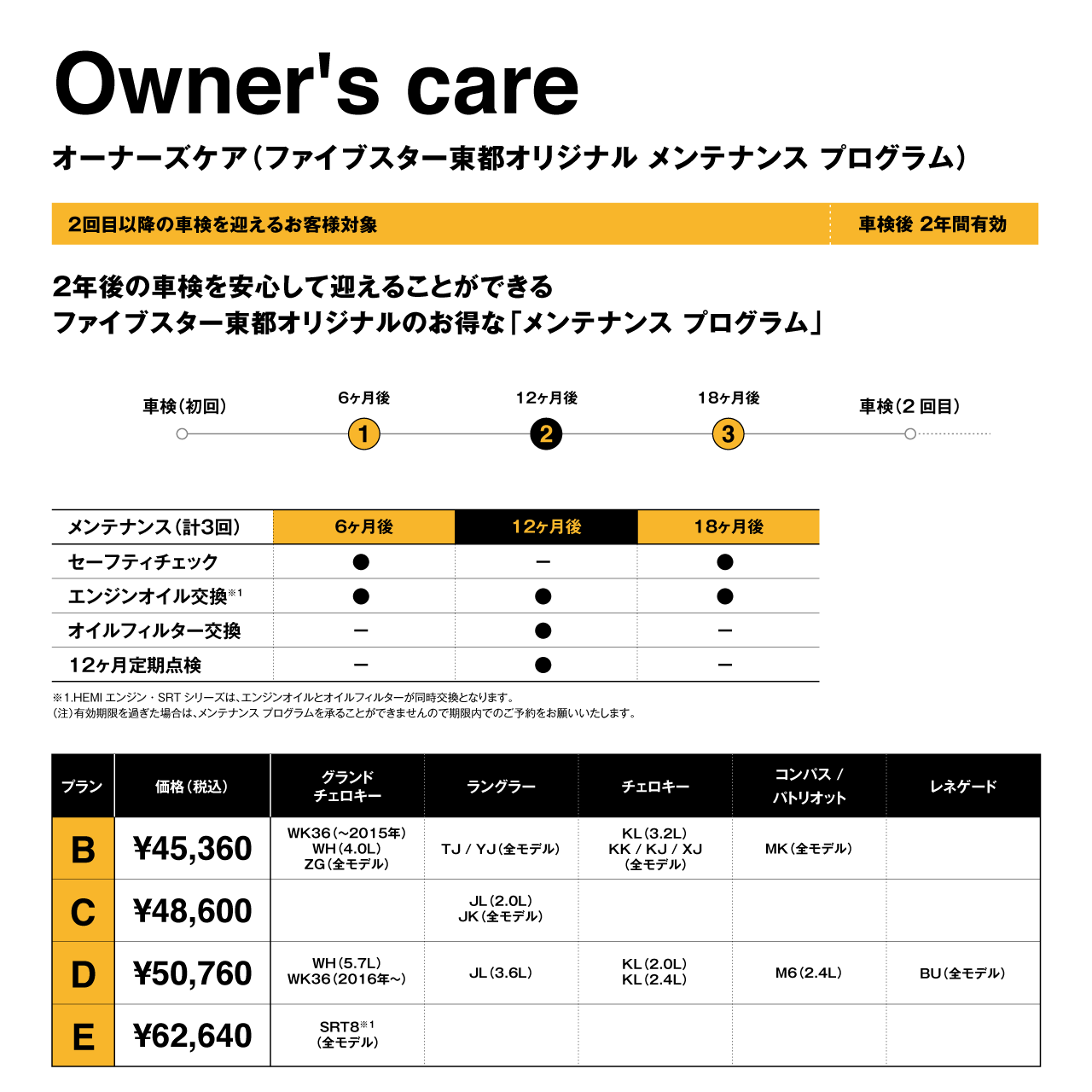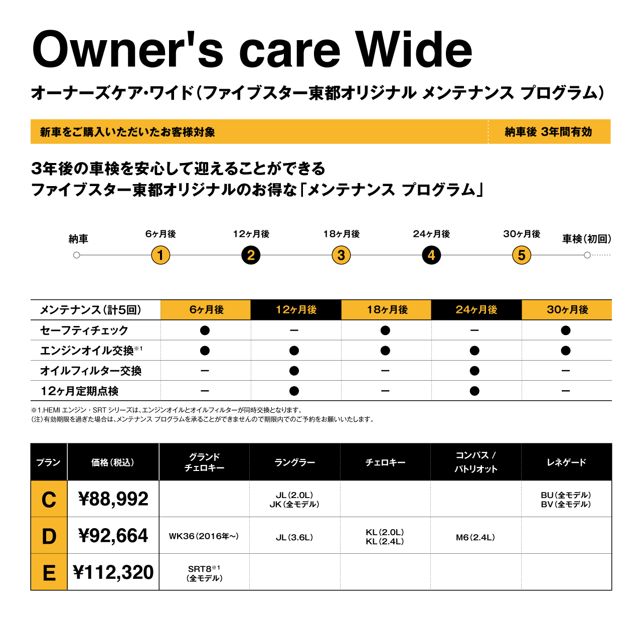 3年間プランの Owner's care Wide(オーナーズケア・ワイド)と2年間プランの Owner's care(オーナーズケア)の2種類のメンテナンスプログラムをご用意しております。