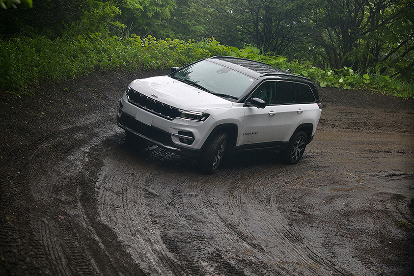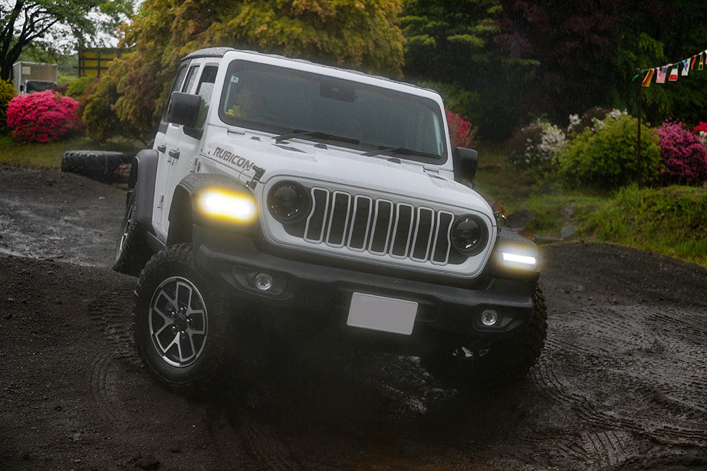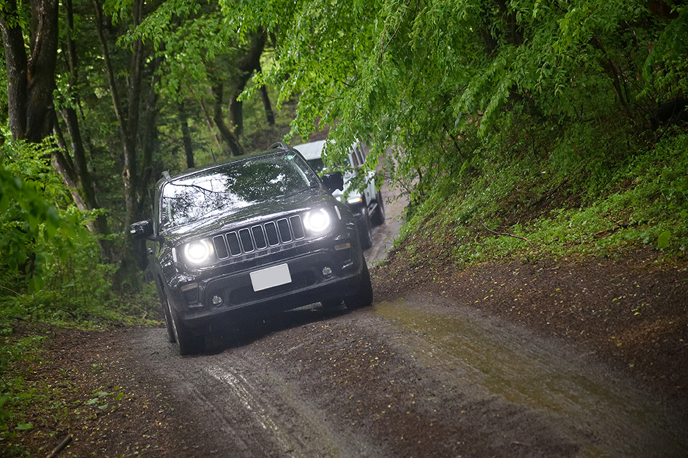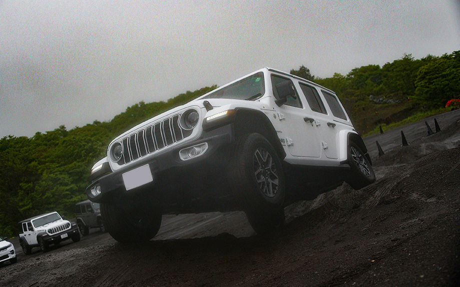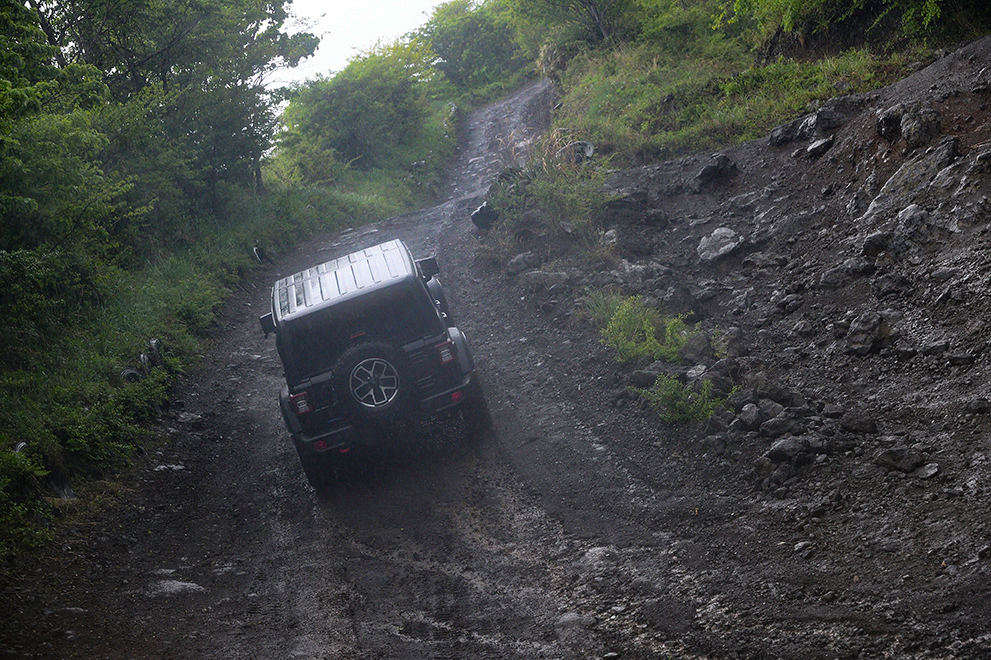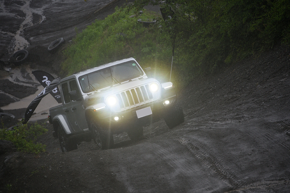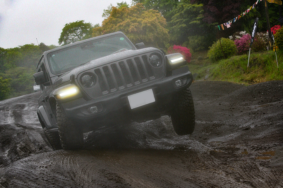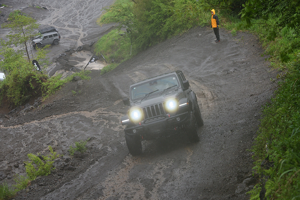 そしてハイライトは、最大傾斜25度以上の登坂が400m以上続く「ヒルクライムコース」です。雨のため路面のコンディションが危ぶまれましたが、滑りながらも各車は果敢に登坂。悪路でこそ発揮されるジープの走破性を思う存分味わえる環境でした。