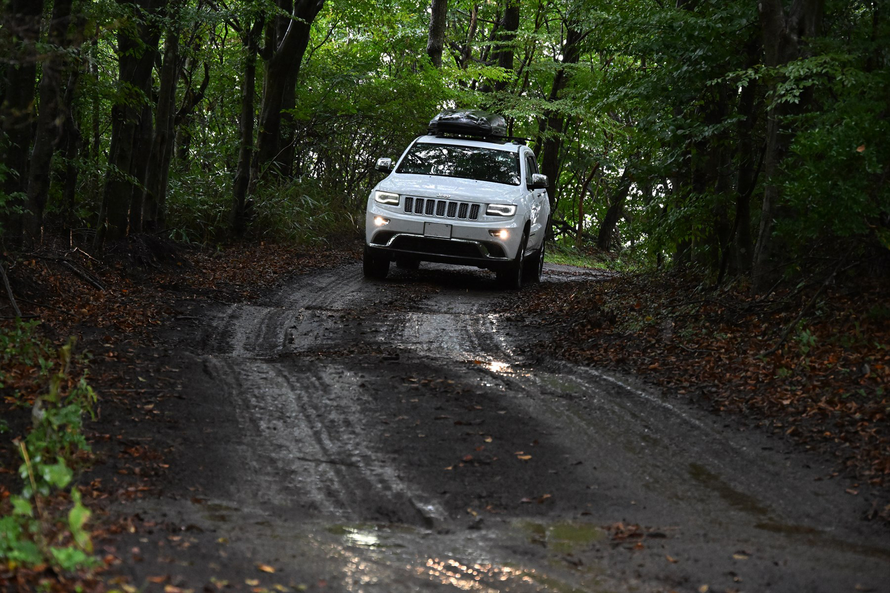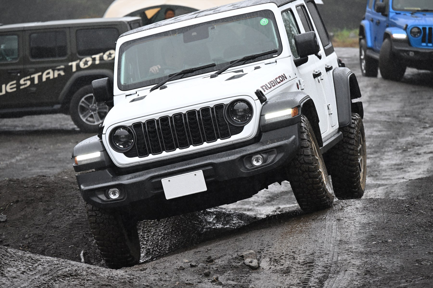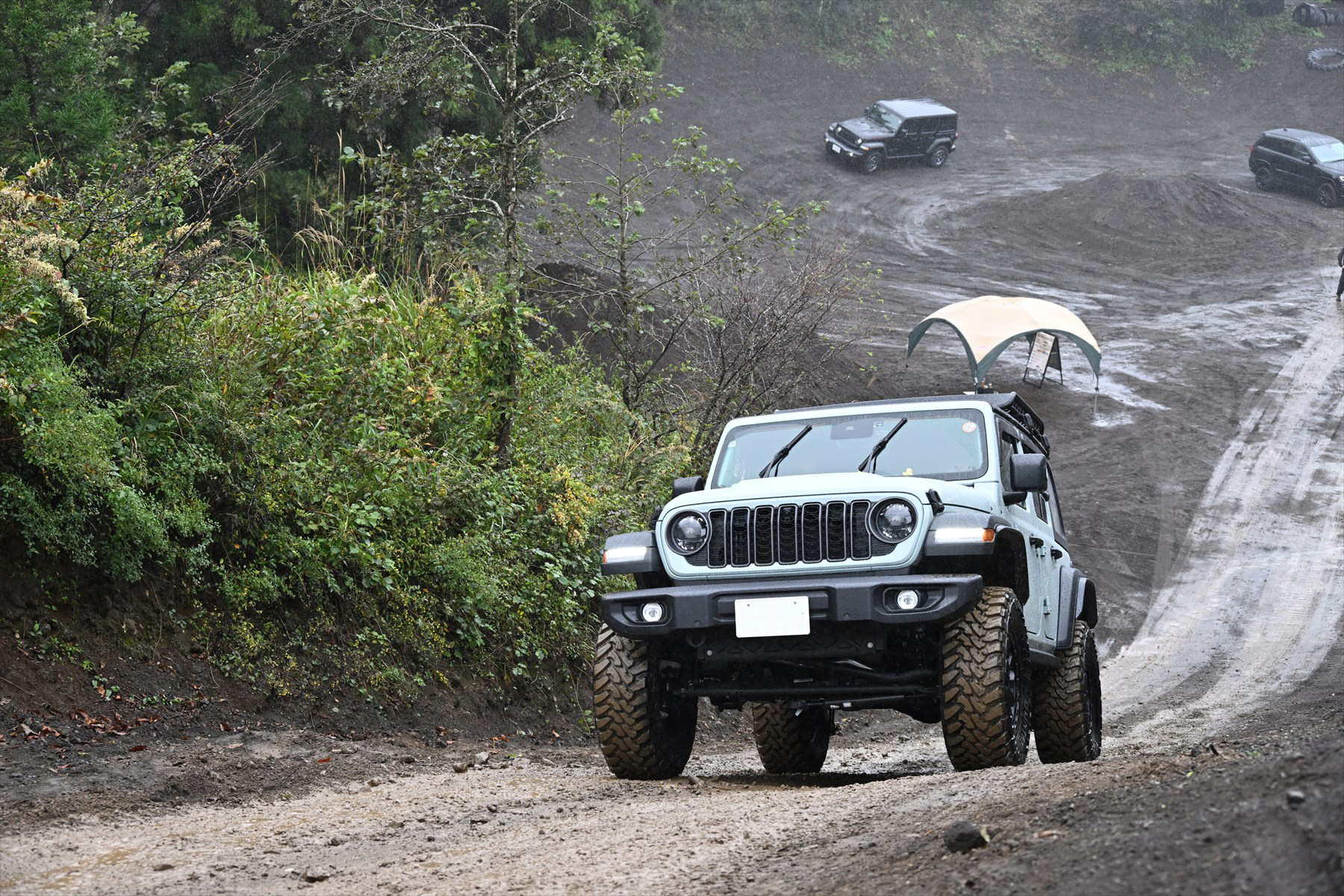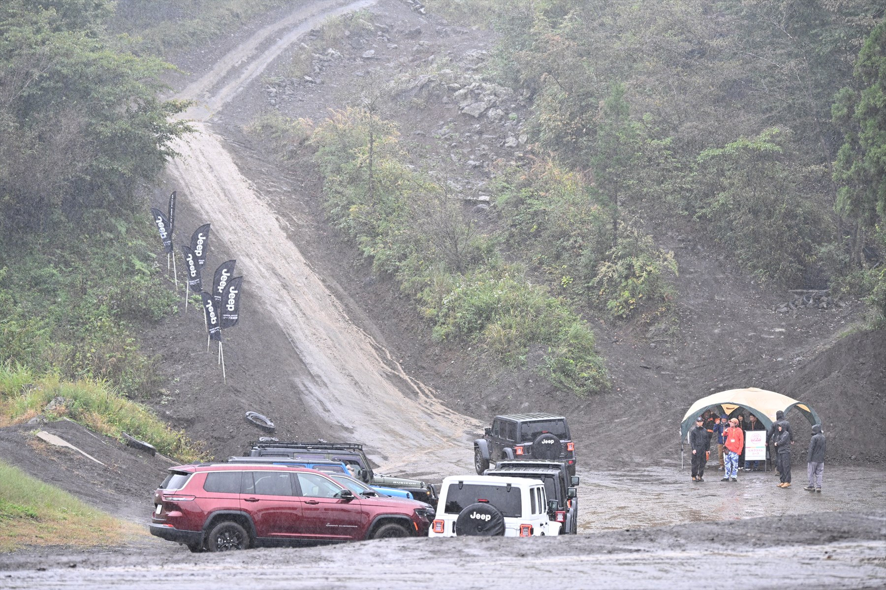 そしてハイライトは、最大傾斜25度以上の登坂が400m以上続く「ヒルクライムコース」です。雨のため路面のコンディションが危ぶまれましたが、滑りながらも各車は果敢に登坂。悪路でこそ発揮されるジープの走破性を思う存分味わえる環境でした。