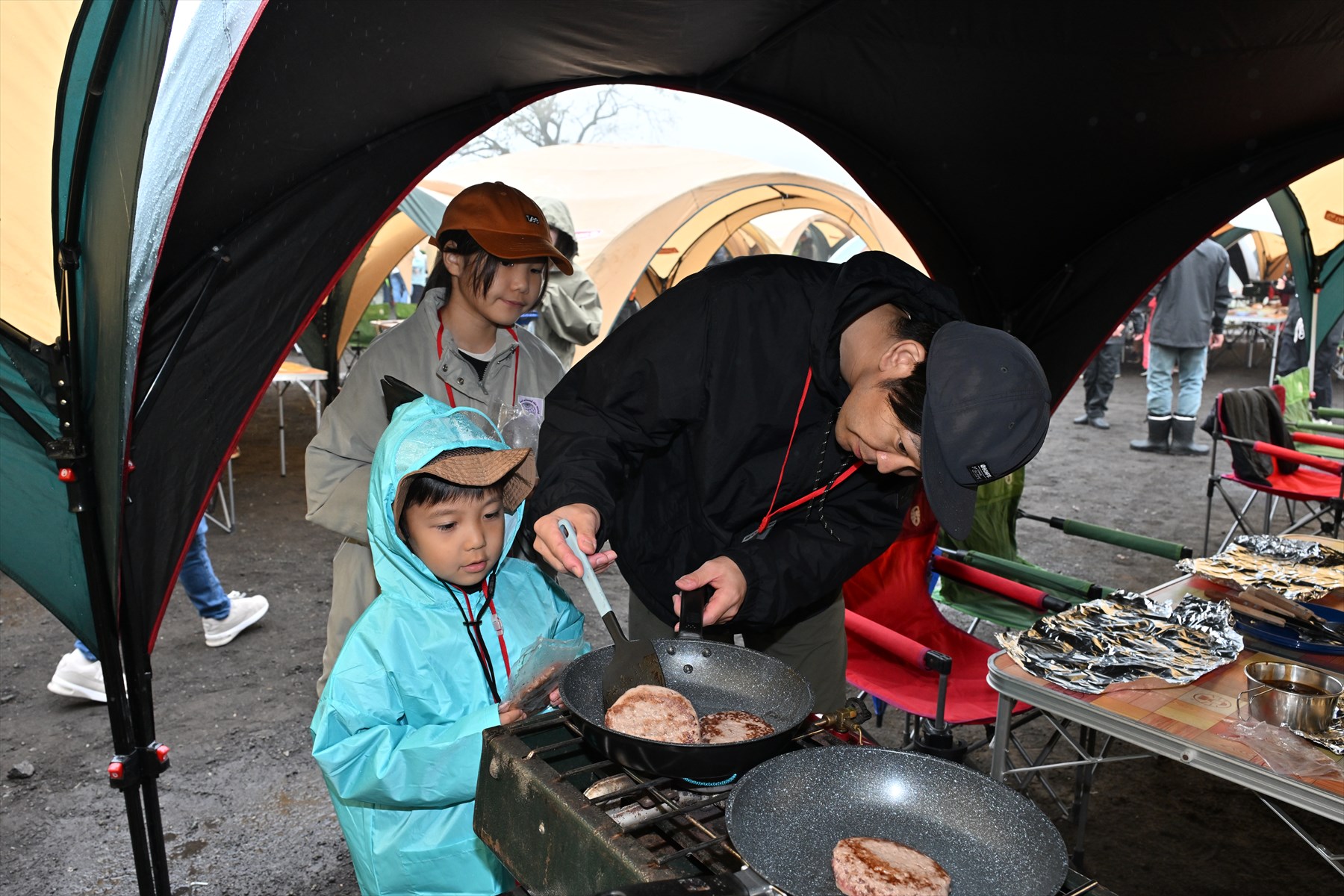 快適生活研究家である田中ケン氏によるアウトドアクッキング。今回はハンブルグステーキのレクチャーを行いました。ご自身で焼いた熱々のハンブルグステーキを堪能しました。